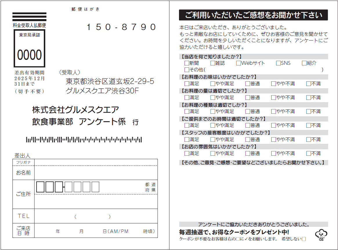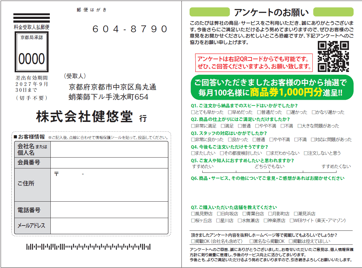 来店・購入後に配布し、再注文や紹介につながる情報を得る構成が有効です。