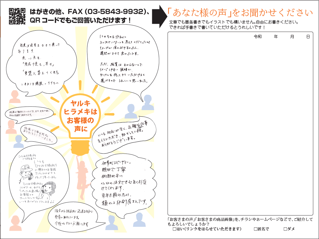 お客様の声は、設問の内容や紙面の設計によって、こちらが得たい情報を自然に引き出すことができます。重要なのは、「どのように配布し、どのように伝え、どのように回収するか」という流れ全体を設計することです。どんな回答を得たいのかを明確にしたうえで、設問・デザイン・回収方法を一体で考えることで、アンケートは単なる意見収集から「信頼を育てる仕組み」へと変わります。また、紙面の見やすさや配色など、デザイン面での工夫も回答率に影響します。