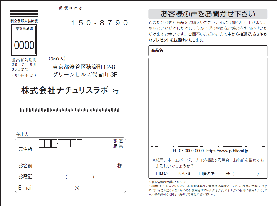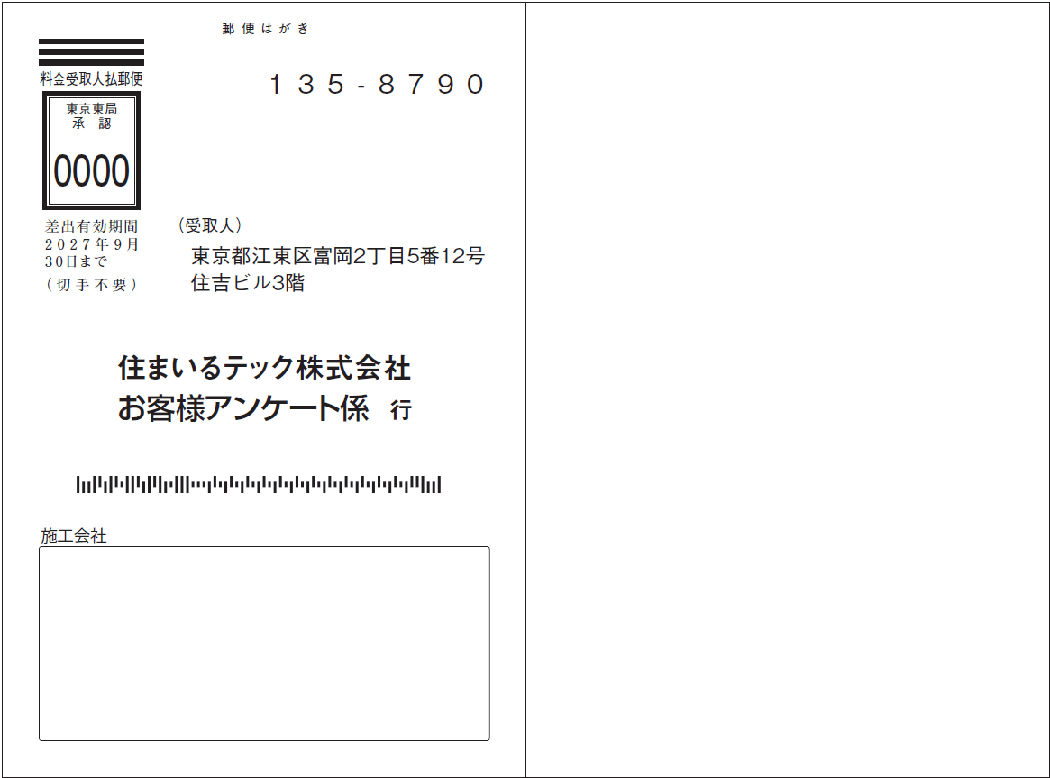 差出人欄を「個人」ではなく会社名で充分な場合に有効なはがきです。 会社には社判があるため、四角枠を設けることでスタンプを活用しやすく、手間を省けます。 また、元売り側が代理店経由でお客様の声を集めたいときにも便利です。代理店ごとにスタンプ を押してもらえば、どこからの回答か把握でき、効果的な運用ができます。