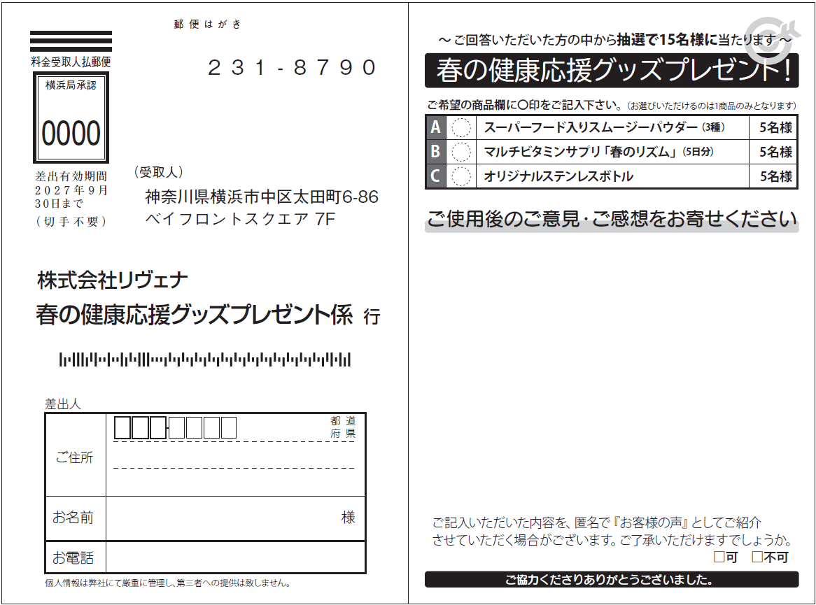 【プレゼントなし・フリー記載・3面はがき・記入例あり】