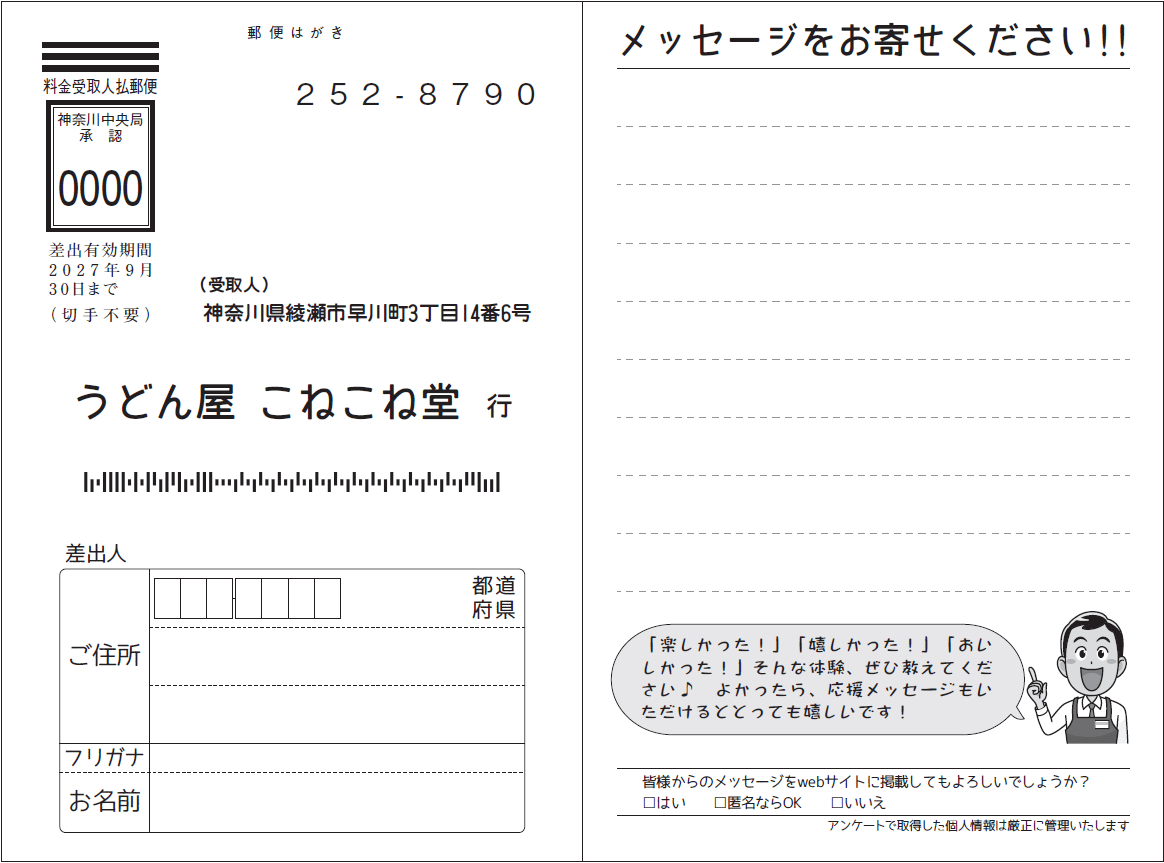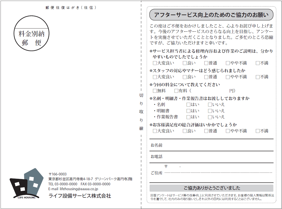 サービス終了後に会社から往復はがきを郵送し、返信を受け取る方式です。