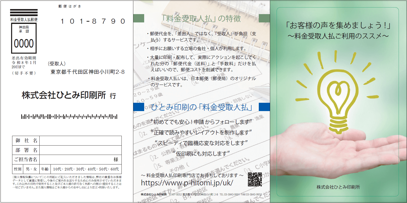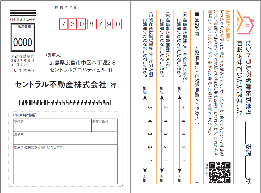 差出人欄を空白の四角枠でデザイン 会社印(社判)や会社スタンプが押せる仕様 本店主導の収集も、代理店ごとにスタンプを押してもらう事で識別可能 大量生産に対応でき、コスト削減につながる