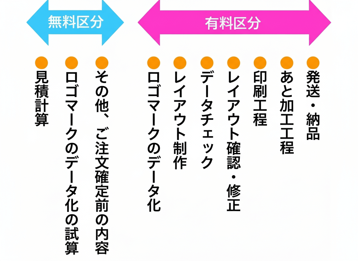 制作の進行状況によって、キャンセル時の扱いや費用が異なります。ひとみ印刷所では、作業内容を「無料区分」「有料区分」に分けてご案内しています。