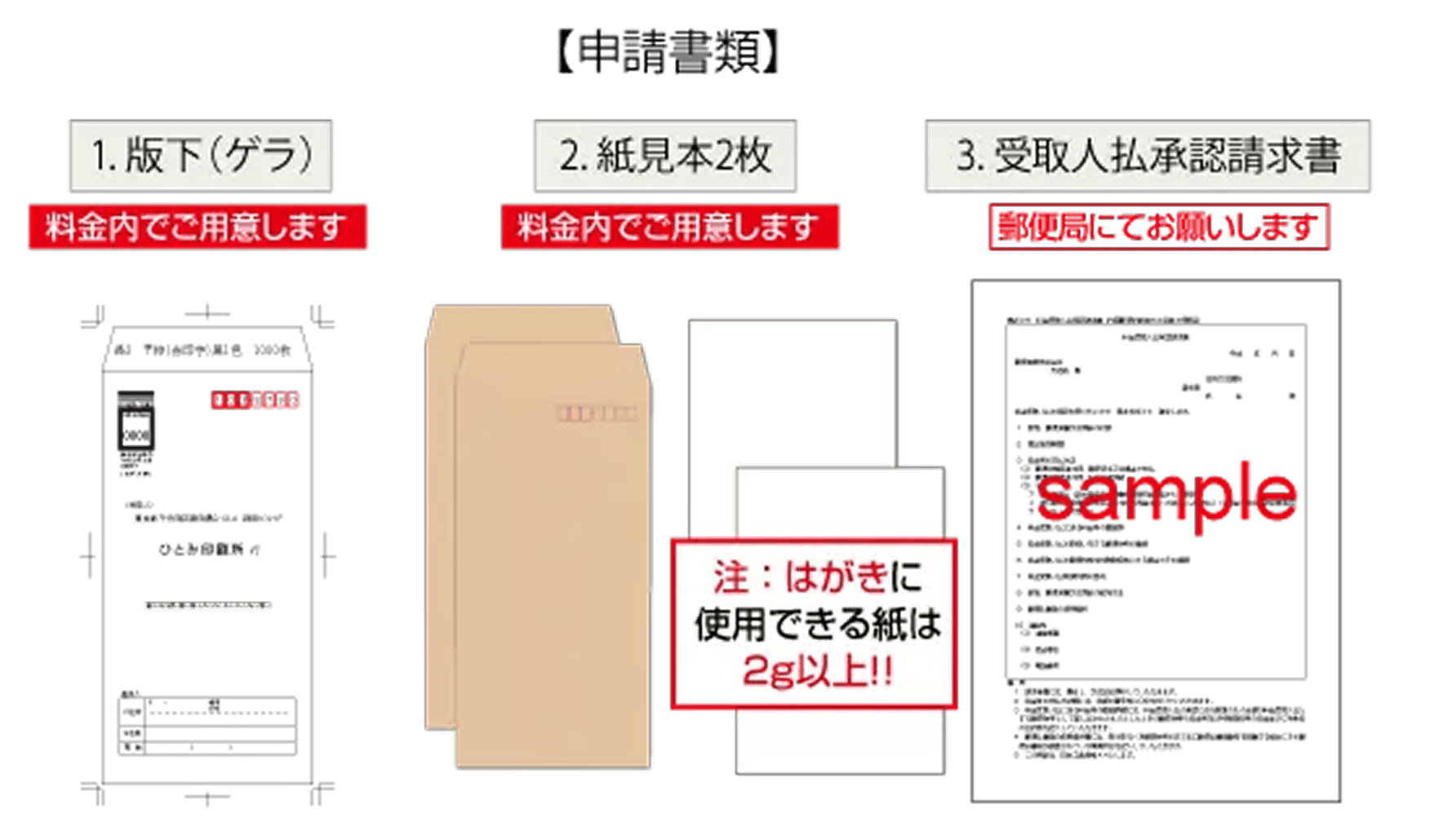オーダーが前提となりますが、申請に必要な「レイアウト見本(ゲラ・版下)」と「紙見本」は料金内で作成いたします。あわせて、当社作成の「料金受取人払い進行方法(簡易マニュアル)」も同封してお送りします。 - 封筒の仕様について