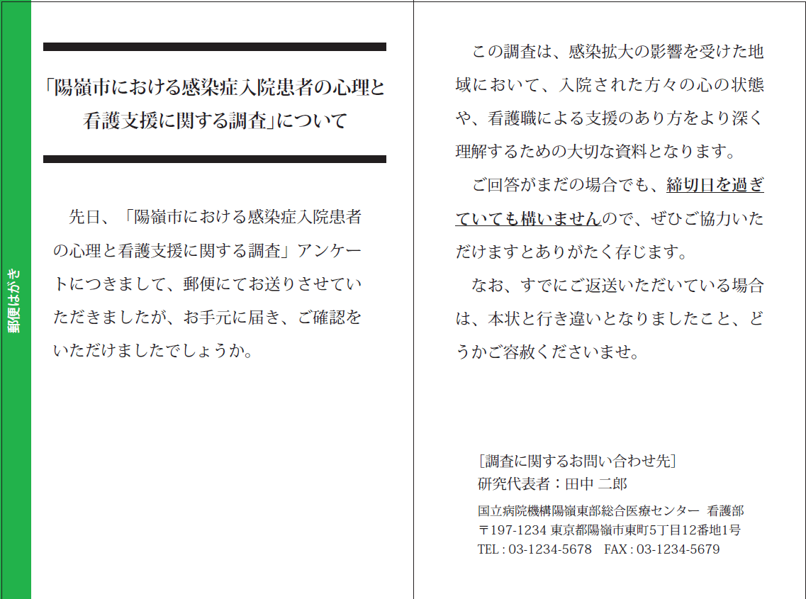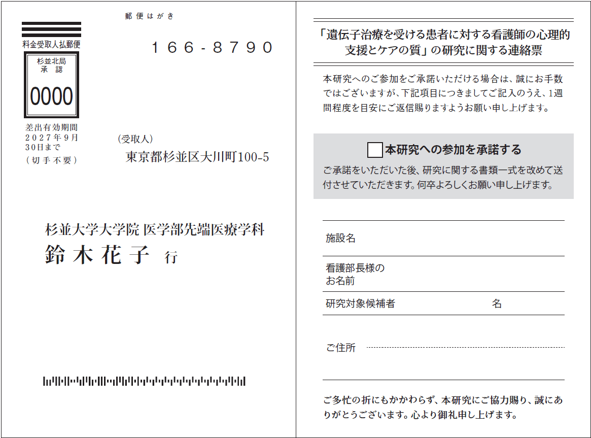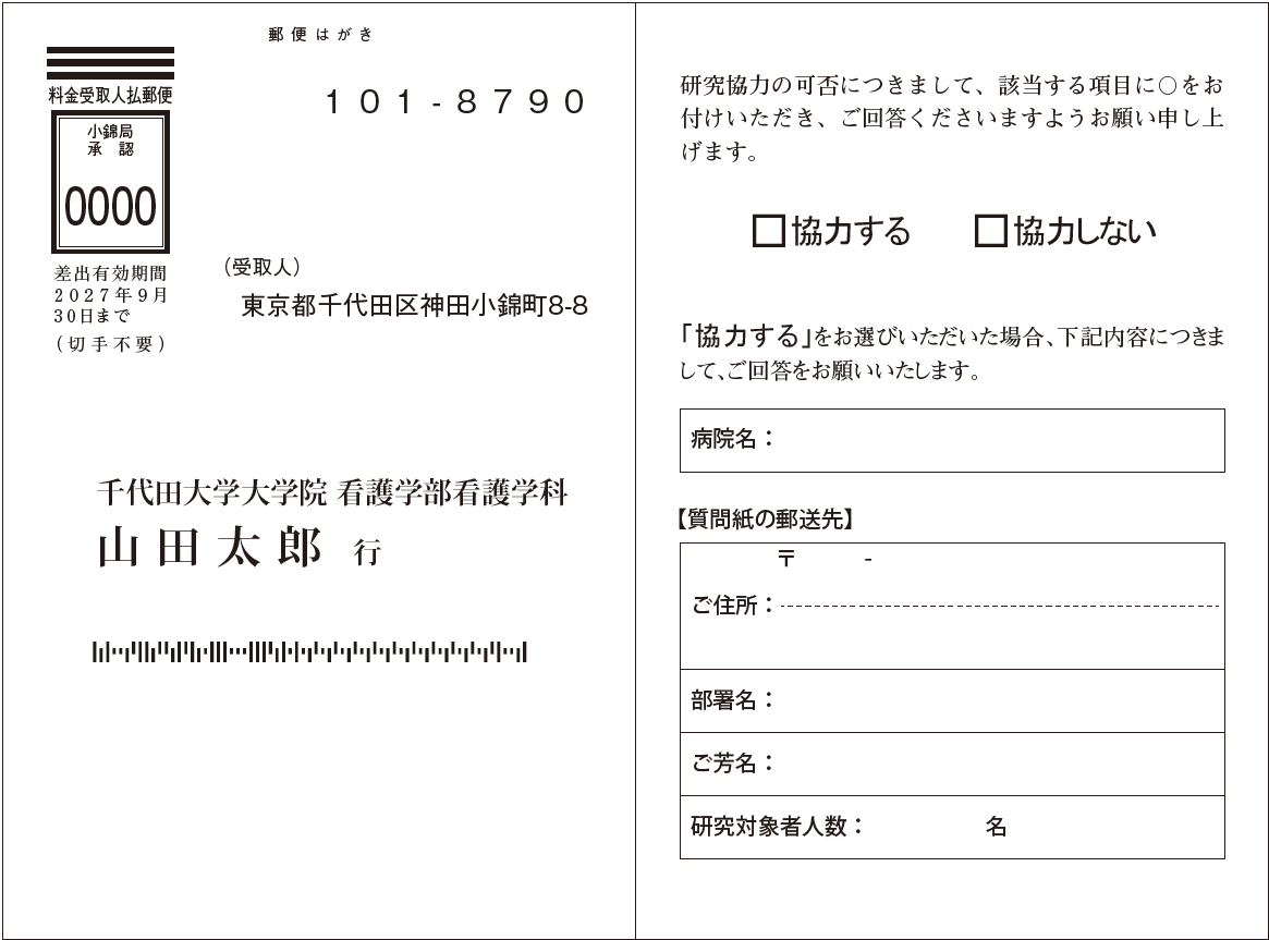 調査票とは別に返送できるため、匿名性を確保しやすく、 また「あとからでも投函できる」柔軟性があります。 倫理審査や大学附属病院の研究など、厳密な個人情報管理を求められる場合に適しています。 - 用紙形式