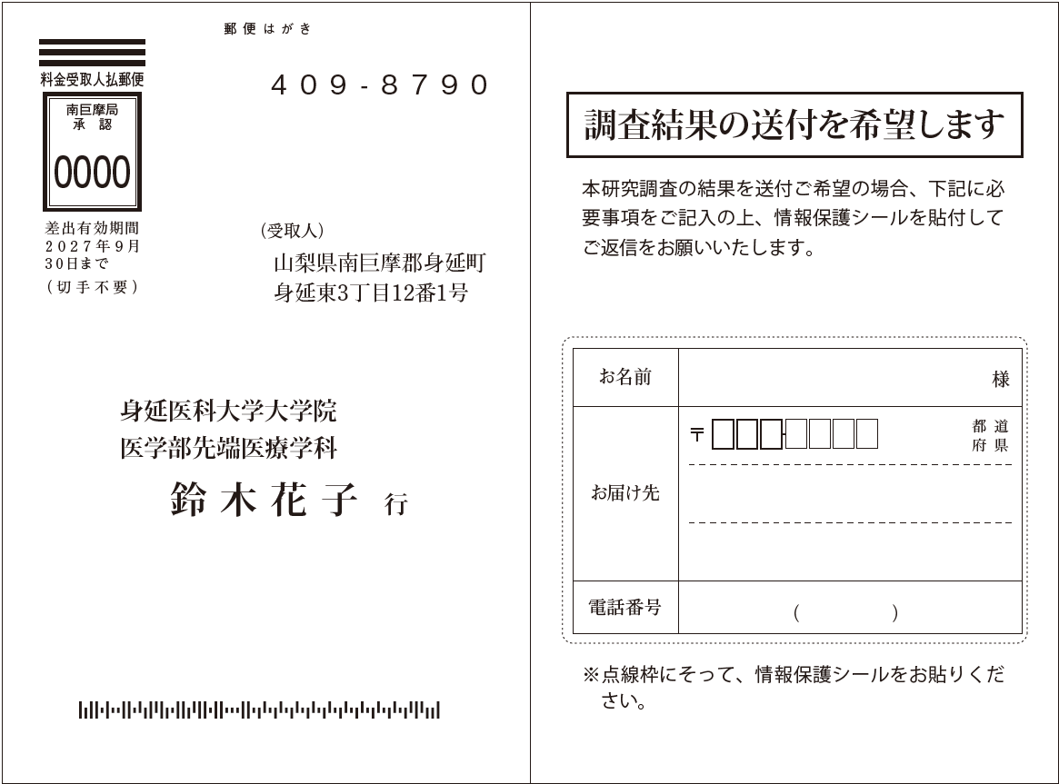 調査結果を希望者に送付するためのはがき形式の例です。研究への信頼性を高め、協力者との関係を長期的に築くために有効です。