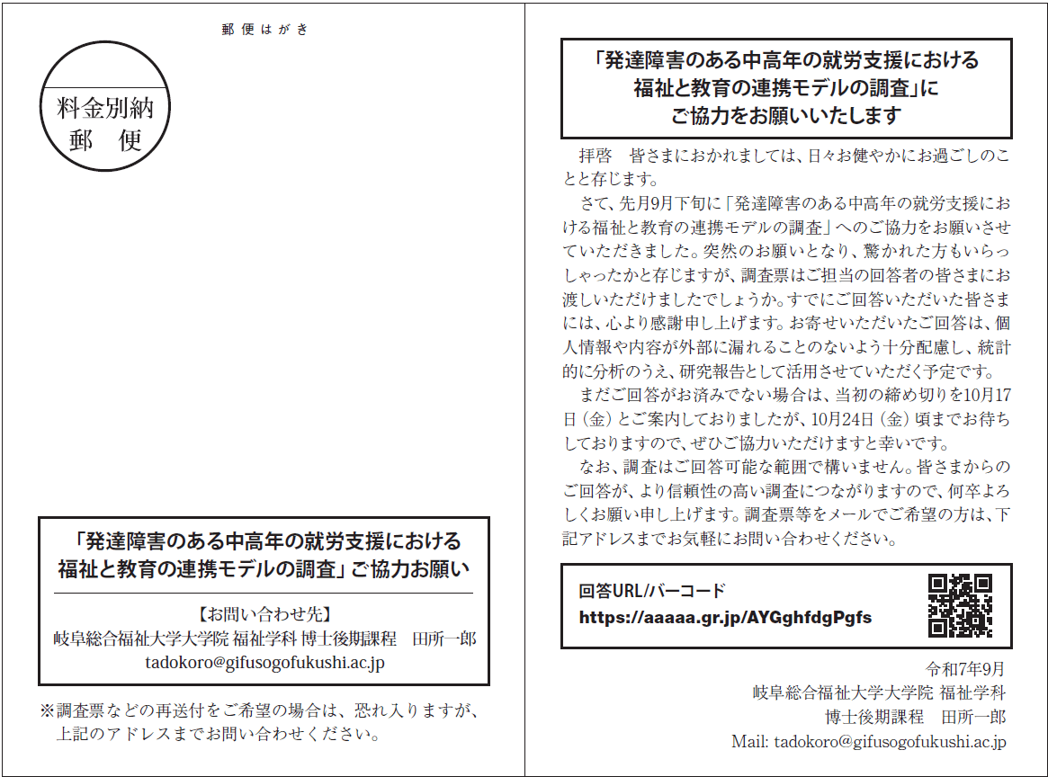| 協力依頼・リマインドはがき | 私製または官製 | 上質135kg/黒1〜2色 | 回答案内・リマインド・結果報告にも使用できる。 |