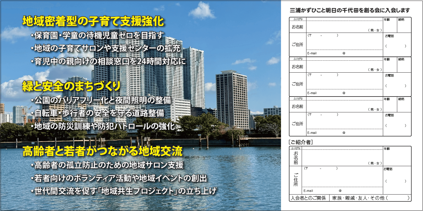 ひとみ印刷所で標準としているフォーマットです。後援会会員募集に必要な基本要素をすべて盛り込んだ構成で、幅広い用途に対応できる。