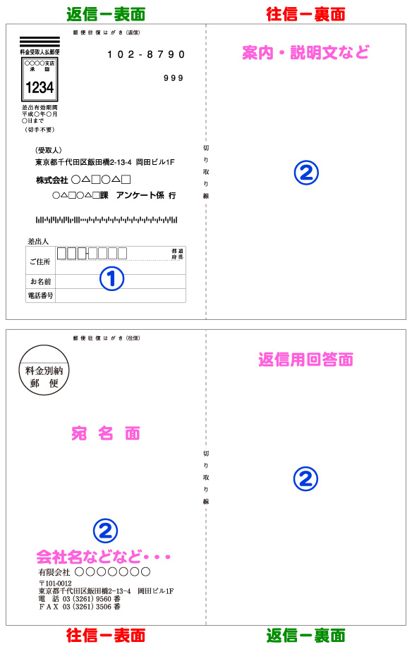 また、単純な「往復はがき」と認識せずに、説明文・案内文で多くの面積を使って、キリトリ線を印刷して、ユーザー様に、切り取って投函して頂く場合にもお使い出来ます。ちなみに、ひとみ印刷所の「お客様の声」を集めるはがきは、このタイプで、ご案内&収集しております。