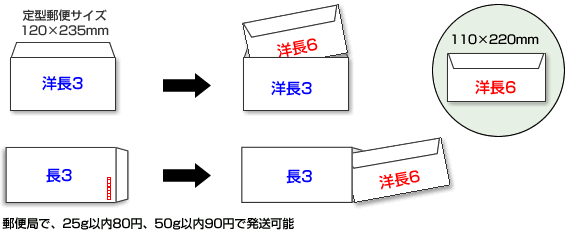 長3・洋長3封筒の中に収まるため、返信用封筒として同封しやすく、保管や配布の面でも扱いやすいサイズです。封筒自体の単価はやや高めですが、封筒を折る作業が不要になるため、封入作業を含めた運用面では効率的なケースがあります。