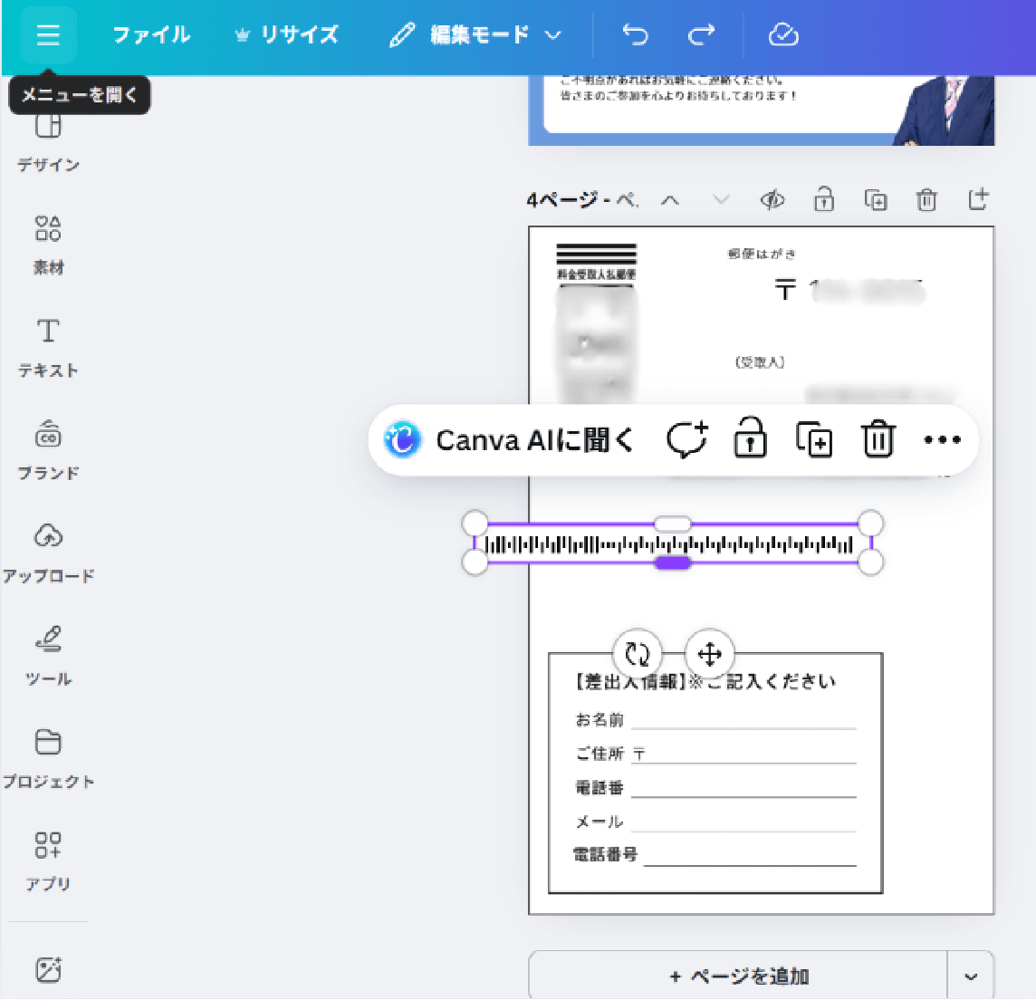 ゲラの作成は、個人のスキルによって分かれます。私はせいぜい個人の年賀状をスマホで簡単に作る程度のスキルです。AIに投げて、提案されたデザインを参考にしながらCanvaで作成しました。 どんな構成にするのか、出来るだけ返信率を高めたいのでわかりやすいレイアウトなどもネットで参考にしました。