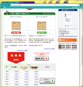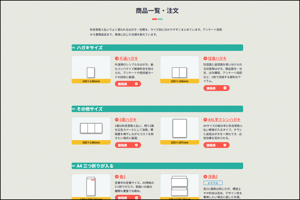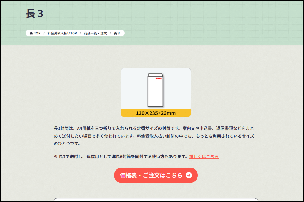 商品一覧・注文から作りたいサイズ(長3、ハガキなど)の商品をクリックして、詳細ページへ進みます。「価格表」ボタンをクリックすると、枚数ごとの概算費用を確認することができます。