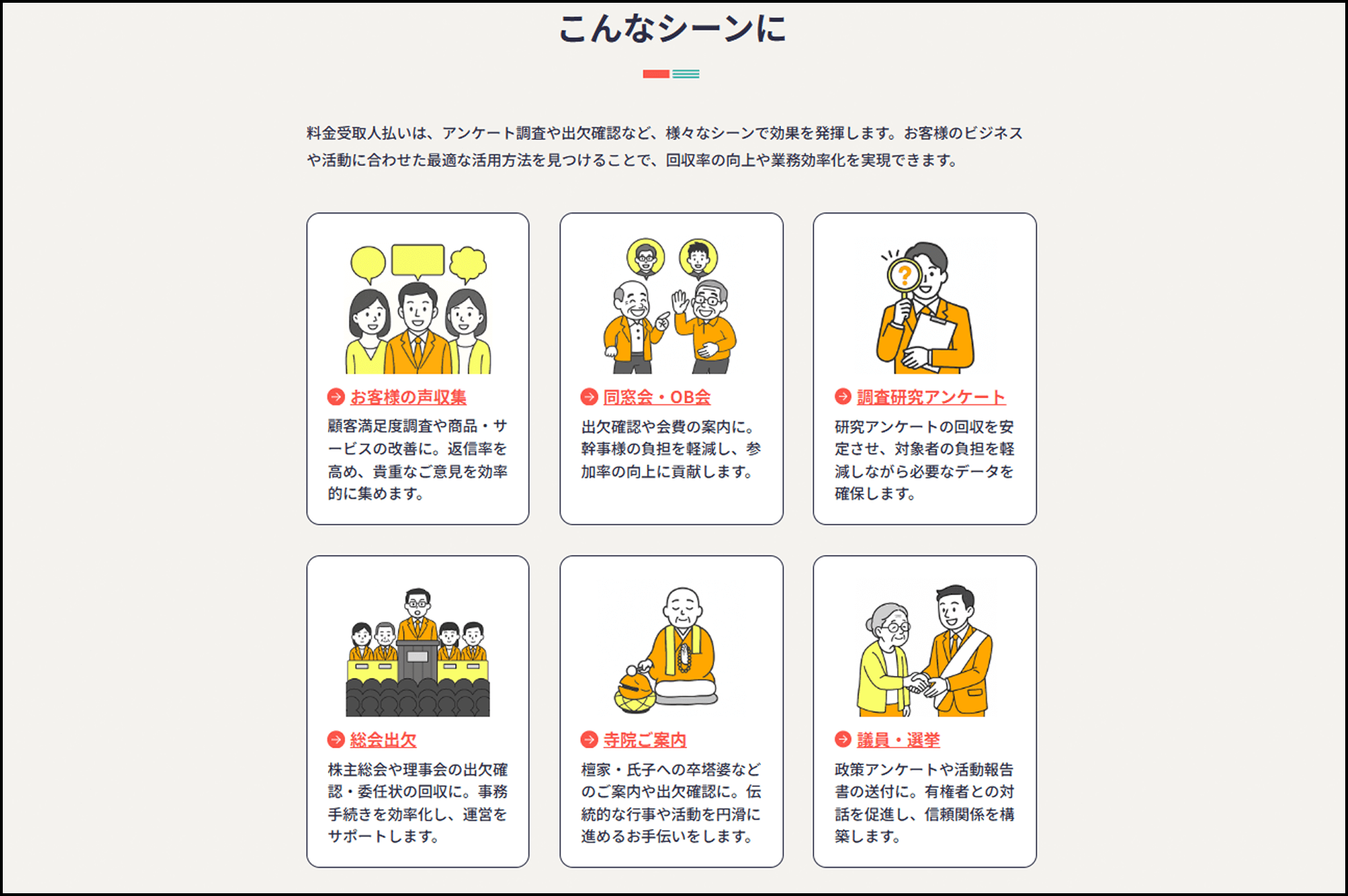 まずはトップページから、用途に近い「シーン」を選んでみてください。 「同窓会」や「アンケート」など、目的に近いものがあれば、その用途のノウハウやおすすめのセット内容がわかります。 ぴったり当てはまらなくても、似た用途を見るだけで仕様決めのヒントになりますので、迷っている方はぜひ一度ご覧ください。