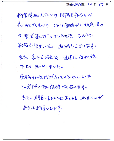 【コメント】 この度はお忙しいところ、「お客様の声」はがきを ご記入、ご投函いただきまして、誠にありがとうございました。 微力ながらお力になれたようですので、 とてもうれしく思っております。 初めての申請ということで、色々と面倒だったり 不安な面もあったかと思いますが、 出来上がってしまいますと、 意外に難しいことはなかったのではないでしょうか。 また何かございましたら、お気軽にご相談ください。 この度は当社にご用命いただきまして、 誠にありがとうございました。 今後ともどうぞ、よろしくお願いいたします。