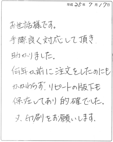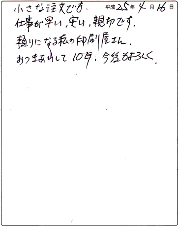 【コメント】 いつも当社をご利用いただきまして、 誠にありがとうございます。 小さな印刷所ですが、 可能な限り、ご要望にお応えしていきたいと思っておりますので、 今後ともよろしくお願いいたします。
