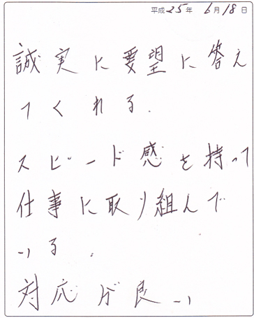 【コメント】 とても温かいお言葉をいただきまして、恐縮しております。 こうしたお声がスタッフ一同、何よりの励みとなります。 今後ともますますのサービス充実に努めてまいりますので、 よろしくお願いいたします。 御社とはご近所ですので、 また何かあれば、お伺いいたします。 どうぞ、お気軽にご相談ください。 この度は当社にご用命いただきまして 誠にありがとうございました。