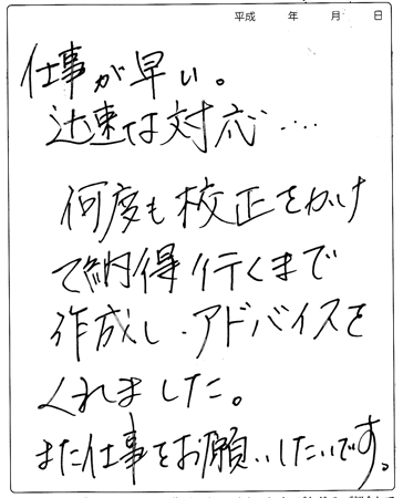 【コメント】 この度はお忙しいなか、「お客様の声」はがきを ご記入、ご投函いただきましてありがとうございました。 温かいお言葉を頂戴しまして、 とてもうれしく思う反面、恐縮しております。 こうしたお言葉ひとつひとつがスタッフ一同、 何よりモチベーションが上がります。 ありがとうございます。 本日より新しいオフィスで、業務開始ですね。 心機一転、益々の社業発展を心よりお祈り申し上げます。 また何かございましたら、ぜひお気軽にご相談ください。 微力ながら、お手伝いさせていただければ幸いです。 この度は当社にご用命いただきまして、 ありがとうございました。 今後とも、よろしくお願いいたします。