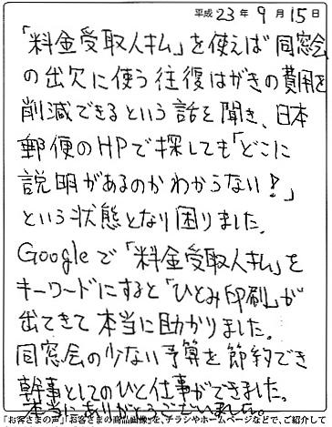 Googleで「料金受取人払;をキーワードにすると「ひとみ印刷」が出てきて本当に助かりました。